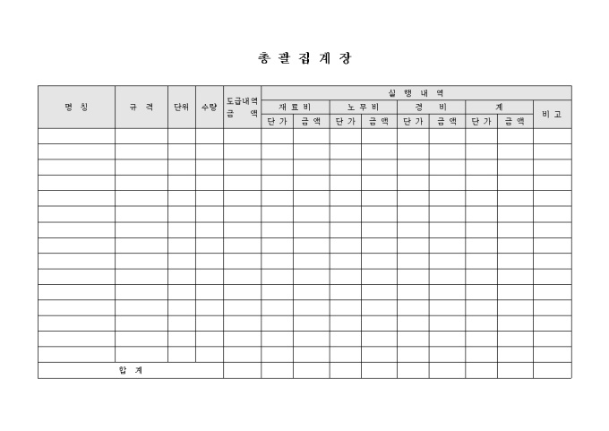 건축 관련 서식으로 명칭, 규격, 단위, 수량, 도급내역 금액과 재료비, 노무비, 경비로 구성된 실행내역의 항목이 합쳐진 총괄 집계장 양식입니다.