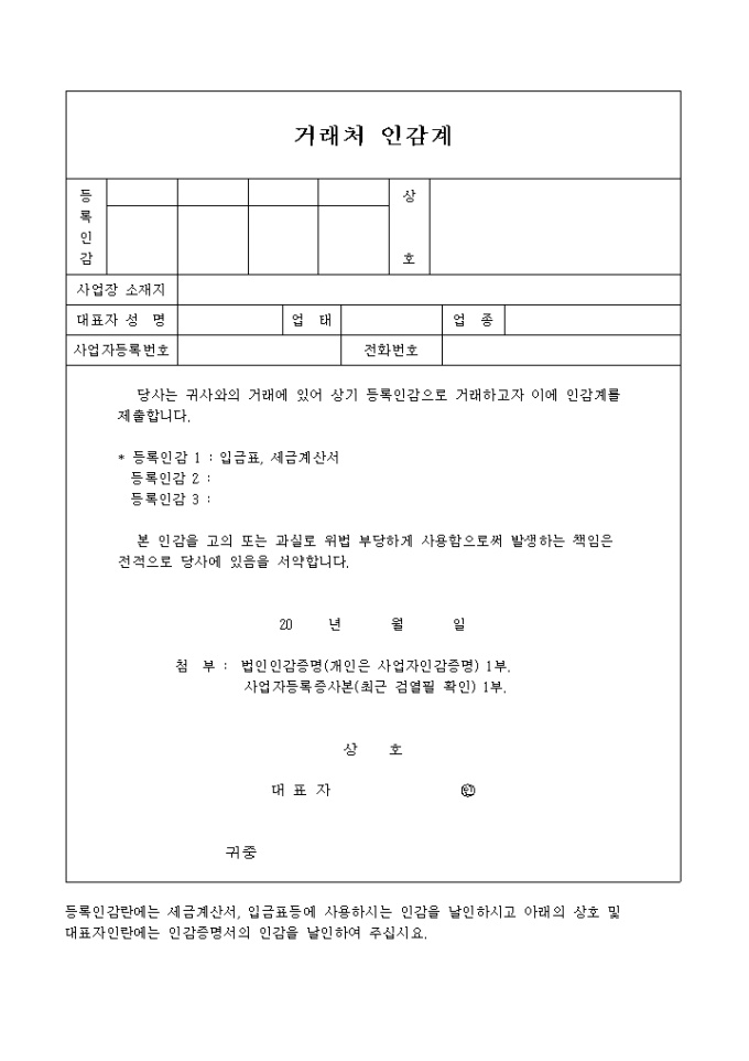 9,000원/월거래처인감계 양식 입니다. 당사는 귀사와의 거래에 있어 상기 등록인감으로 거래하고자 이에 인감계를 제출합니다. * 등록인감 1 : 입금표, 세금계산서 등록인감 2 : 등록인감 3 : 본 인감을 고의 또는 과실로 위법 부당하게 사용함으로 써 발생하는 책임은 전적으로 당사에 있음을 서약합니다.