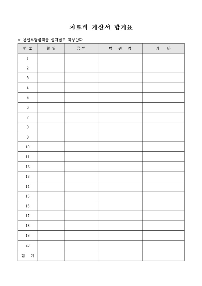 9,000원/월대학 병원 이용시 치료비에 대한 내용을 기재할 수 있는 치료비 계산서 합계표 양식입니다. 월일과 금액, 병원명 등의 항목을 기재할 수 있습니다.