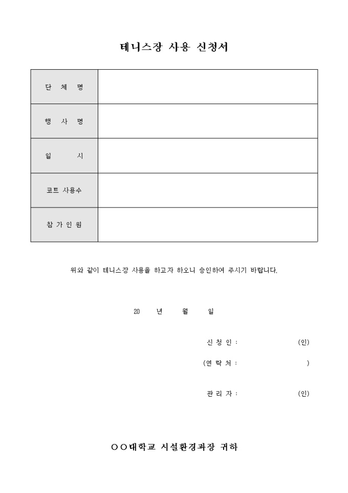 9,000원/월대학교 내의 테니스장의 사용을 신청하는 내용의 서식입니다. 단체명과 행사명, 일시, 코트사용수, 참가인원 수 등의 항목을 기재할 수 있습니다.