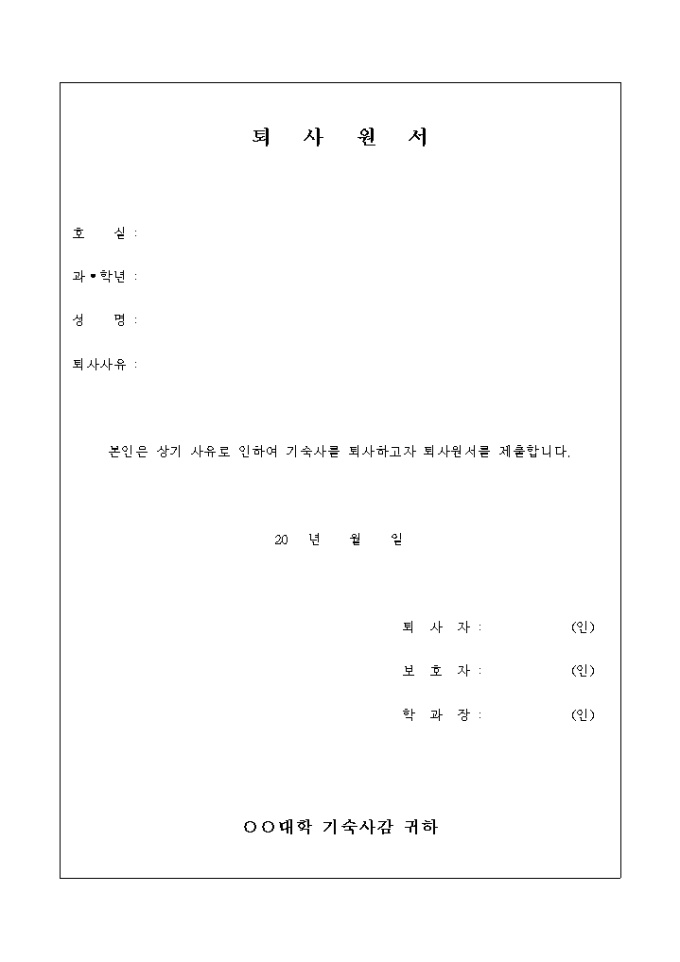 9,000원/월대학교 기숙사의 퇴사시에 제출하는 퇴사원서 양식입니다. 호실과 학과, 학년, 성명, 퇴사사유 등의 내용을 작성할 수 있습니다.