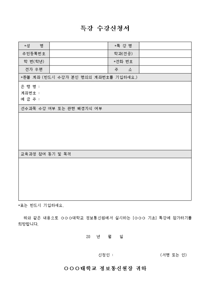 9,000원/월대학 정보통신원에서 실시하는 특강에 대한 수강 신청서 양식입니다. 성명, 특강명, 주민등록번호, 학과, 학번, 전화번호, 전자우편, 주소와 선수과목 수강 여부 또는 관련 배경지식 여부, 교육과정 참여 동기 및 목적 등에 대하여 기재할 수 있습니다.