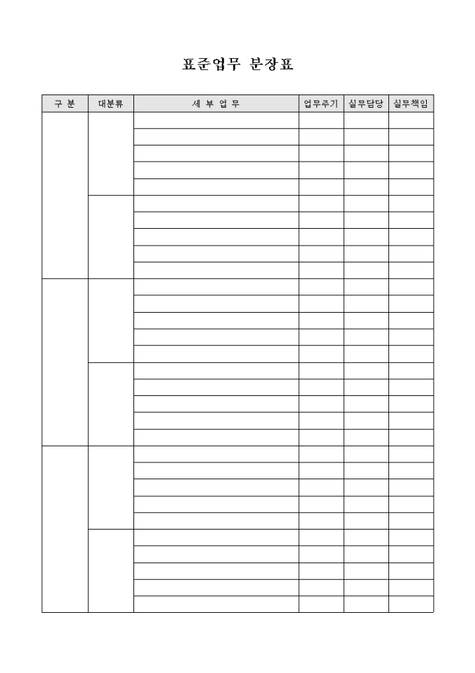9,000원/월대분류, 분류로 구분하여 세부업무를 서술형태로 기입할 수 있도록 하였으며 업무주기, 실무담당, 실무책임의 란이 포함된 표준업무 분장표 양식입니다.