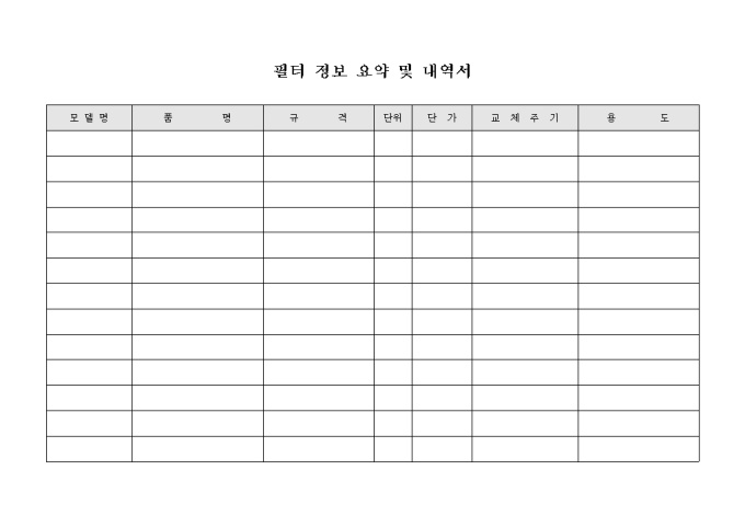 9,000원/월모델명, 품명, 규격, 단위, 단가, 교체주기, 용도의 항목으로 구성된 필터 정보 요약 및 내역서 양식입니다.