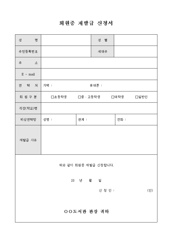 9,000원/월회원증 분실시 재발급 받기 위해 관련기관에 제출하기 위해 만들어졌으며 인적사항을 간략하게 기재하고 재발급 사유에 대해 서술형태로 작성할 수 있게끔 제작된 회원증 재발급 신청서 서식입니다.