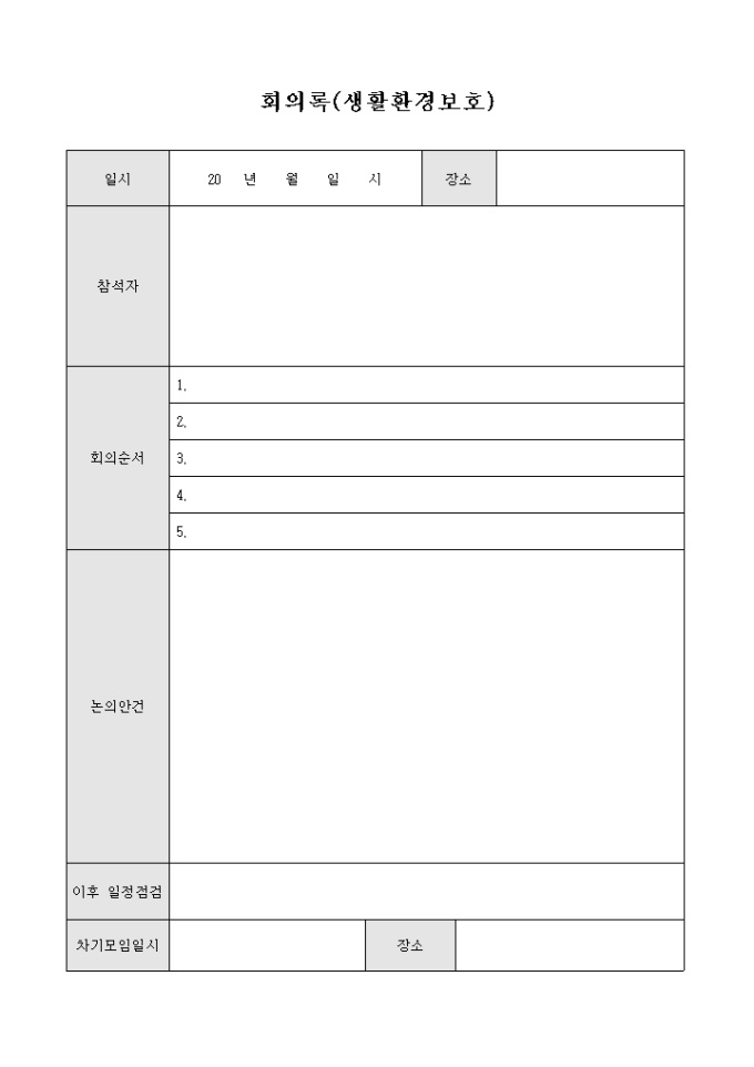 생활환경보호에 대한 회의 내용을 기록하는 회의록 양식입니다. 일시, 장소, 참석자, 회의순서, 논의안건, 이후 일정점검, 차기모임일시 등의 항목을 기재할 수 있습니다.