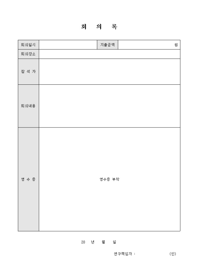 회의 일시, 지출금액, 회의장소, 참석자, 회의내용과 지출 증빙 자료가 포함되어 있는 회의록 양식입니다.