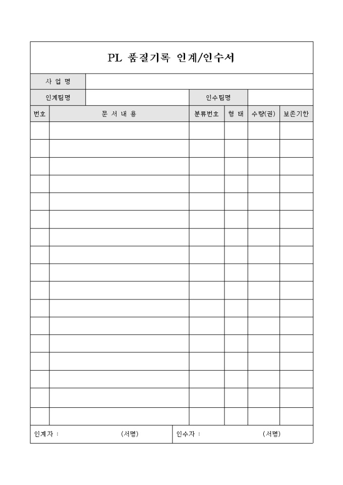 9,000원/월PL 품질기록을 인수인계할 때 사용하는 서식으로 인계팀, 인수팀 명과 문서내용, 분류번호, 형태, 수량, 보존기한 등을 작성하여 사용할 수 있는 서식입니다.