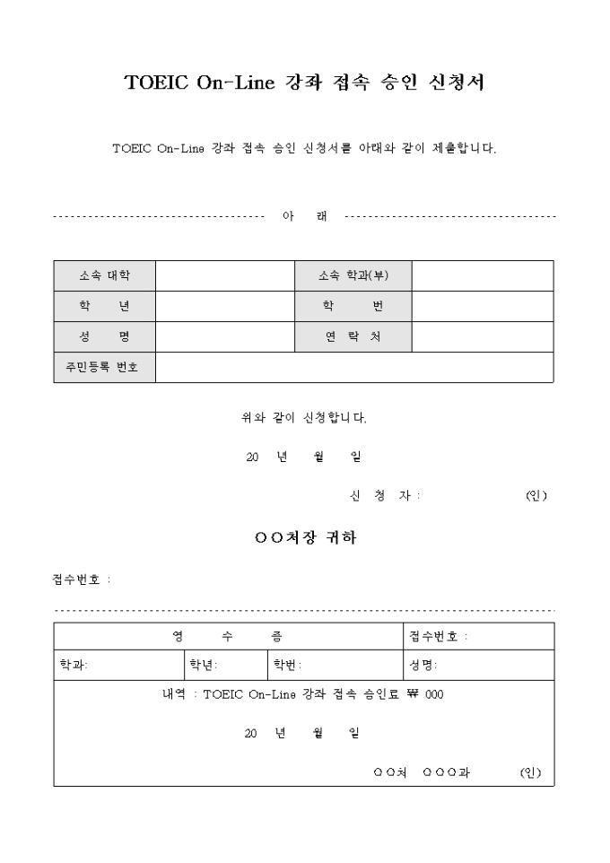 TOEIC On-Line 강좌에 대한 접속 승인 신청서와 강좌 접속에 대한 영수증 양식입니다. 신청자의 소속대학, 학과, 학년, 학번, 성명, 연락처, 주민등록번호 등의 내용을 기재할 수 있습니다.