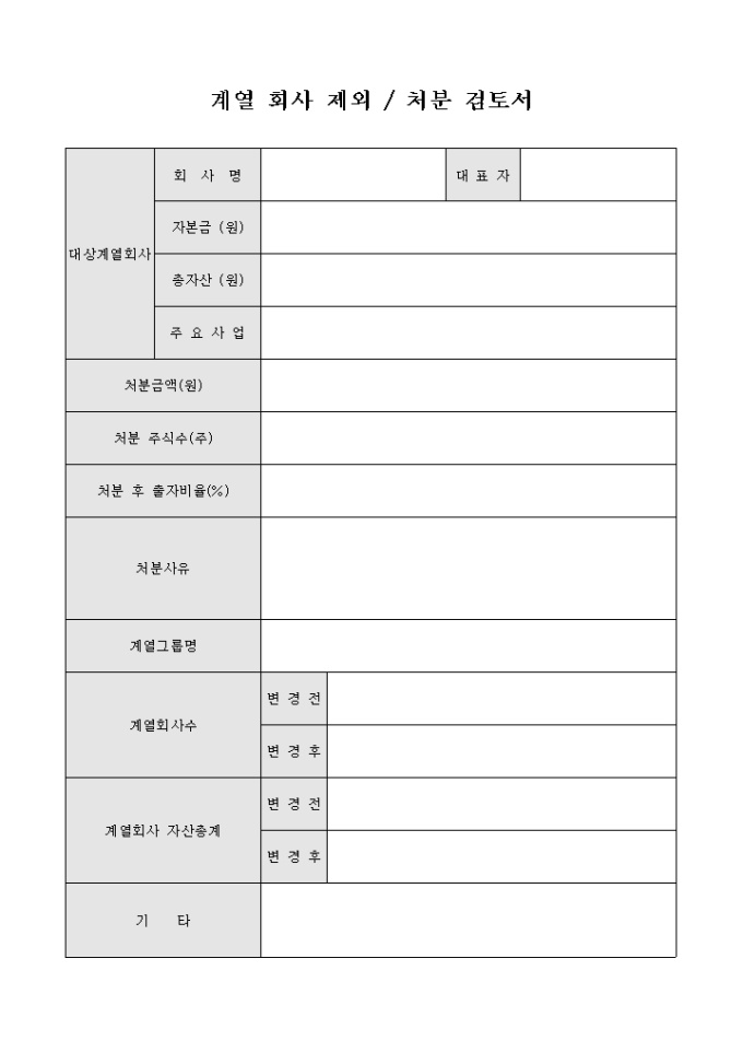 9,000원/월어떠한 사유로 인해 계열 회사를 제외, 처분해야 할 사항이 발생할 때 이에 관련 사항을 기재하여 검토에 사용할 수 있게끔 제작된 서식입니다.