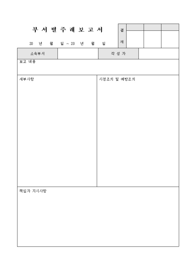 부서별 주간의 업무내용, 각종 사항에 관하여 보고할 수 있게끔 만들어졌으며 세부사항, 시정조치, 예방조치 등의 항목을 서술형태로 작성할 수 있도록 제작된 서식입니다.