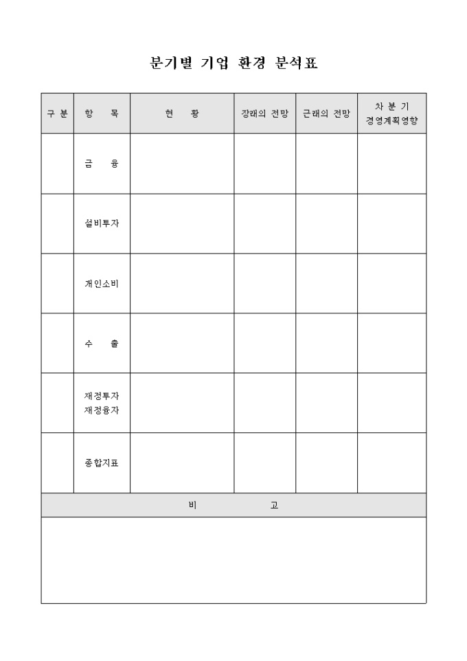 9,000원/월분기별로 기업 환경을 분석, 정리하여 다음분기 경영계획 수립에 참고가 될 수 있도록 제작된 서식입니다.