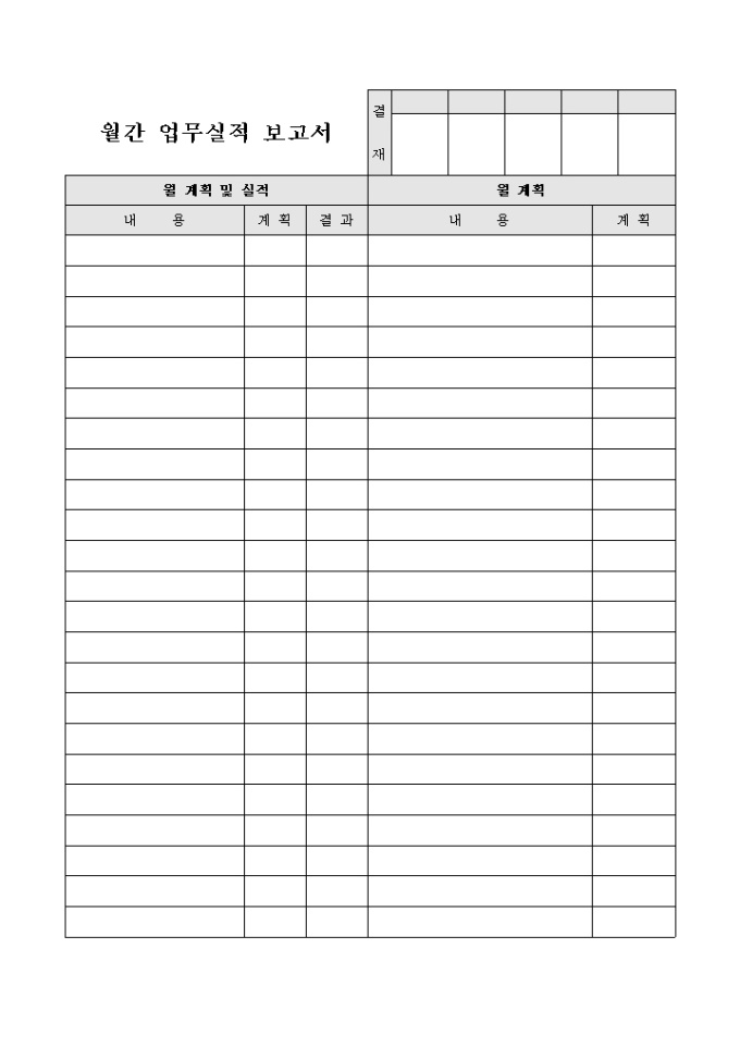 월간의 업무 진행 내용과 그 실적을 기재하고 차월 업무 계획에 반영하여 수립, 기재할 수 있게끔 제작된 서식입니다.