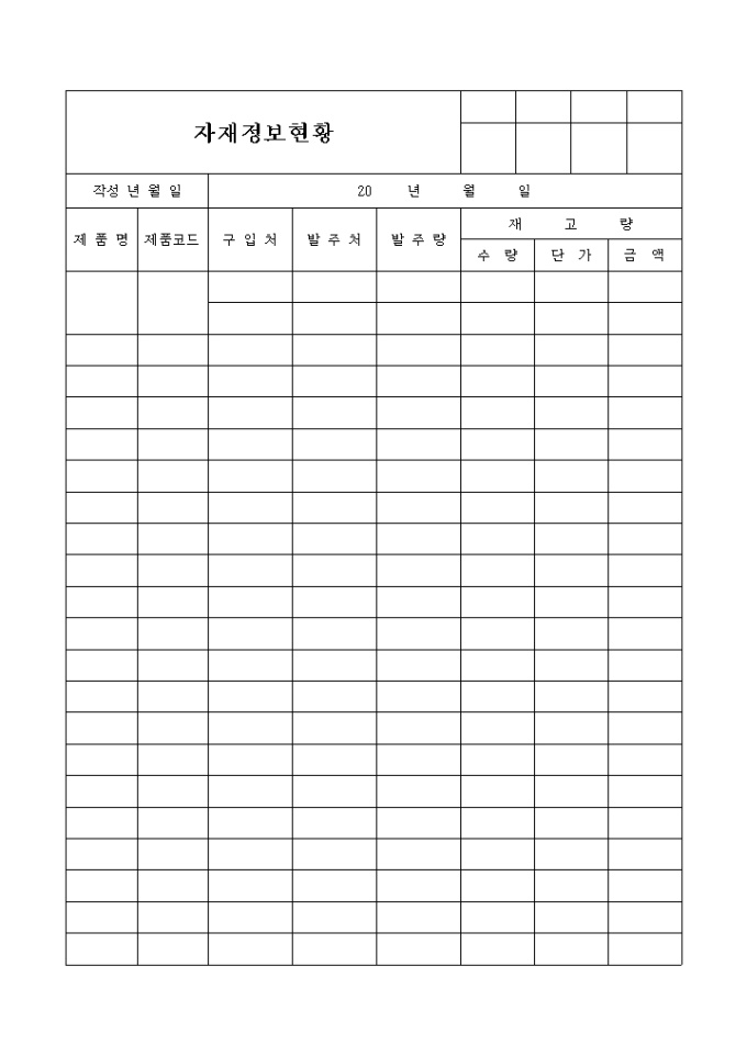 9,000원/월자재정보현황 양식입니다. 제품별 구입처, 발주처, 발주량, 재고량으로 구분하여 관리하시는 양식입니다.