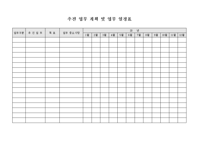 9,000원/월추진하고자 하는 업무에 대한 목표 및 업무 진행시 중요사항과 연간의 업무 일정을 월별로 기재할 수 있도록 구성된 추진 업무 계획 및 업무 일정표 양식입니다.