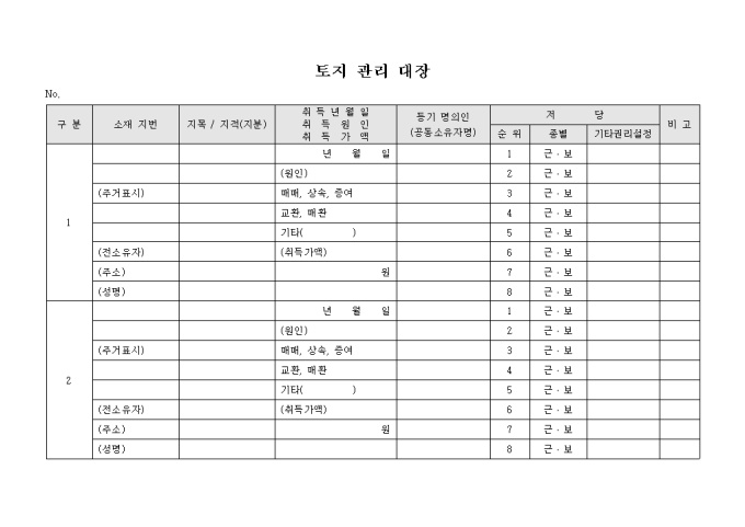 토지의 관리를 위하여 토지 내역 사항을 기록하는 토지 관리 대장 양식입니다. 소재지번, 지목/지적, 취득년월일/취득원인/취득가액, 등기 명의인, 저당 등의 항목으로 구성되어 있습니다.