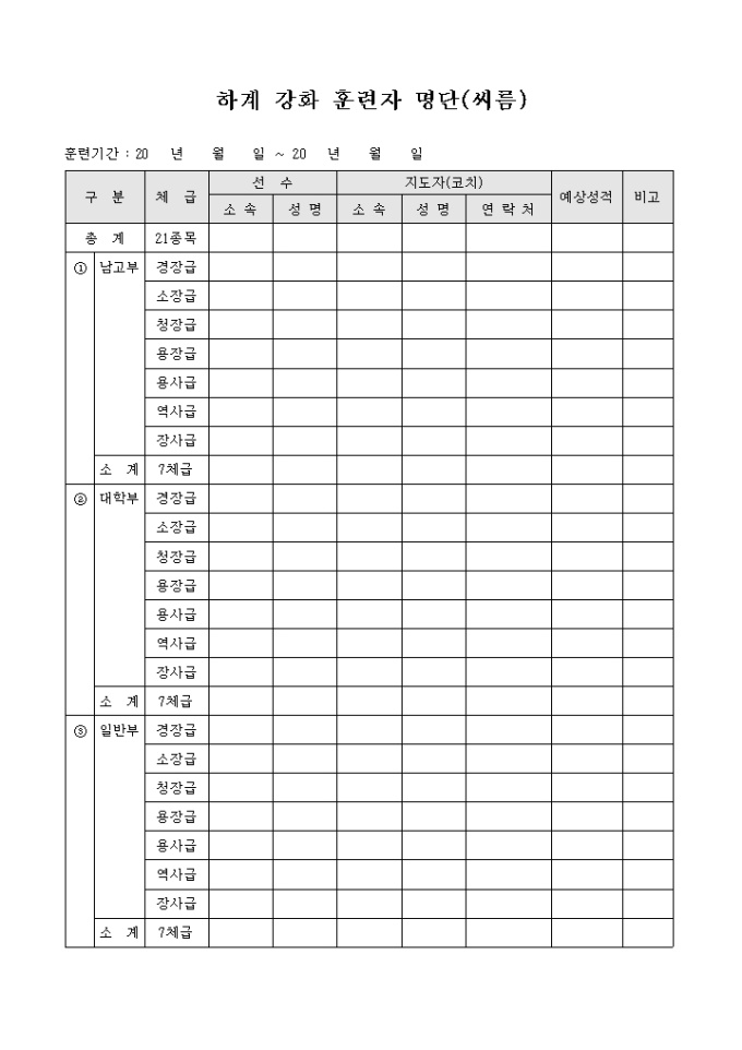 씨름 종목의 하계 강화 훈련자 명단 양식입니다. 체급별 선수명과 지도자, 예상성적 등의 항목을 기재할 수 있습니다.
