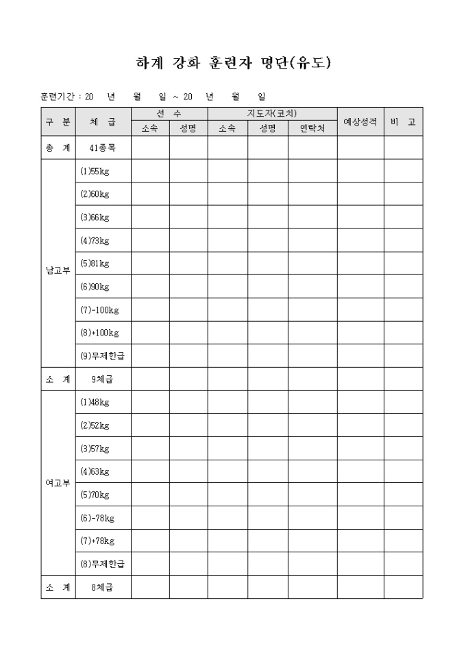 유도 종목의 하계 강화 훈련에 참가하는 하계 강화 훈련자 명단 양식입니다. 체급별 선수명과 지도자, 예상성적 등의 항목을 기재할 수 있습니다.