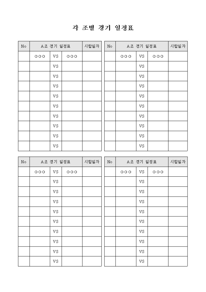 각 조별로 경기 일정을 정리할 수 있도록 만들어졌으며 대진팀명, 시합일자 등을 기입할 수 있게끔 제작된 서식입니다.