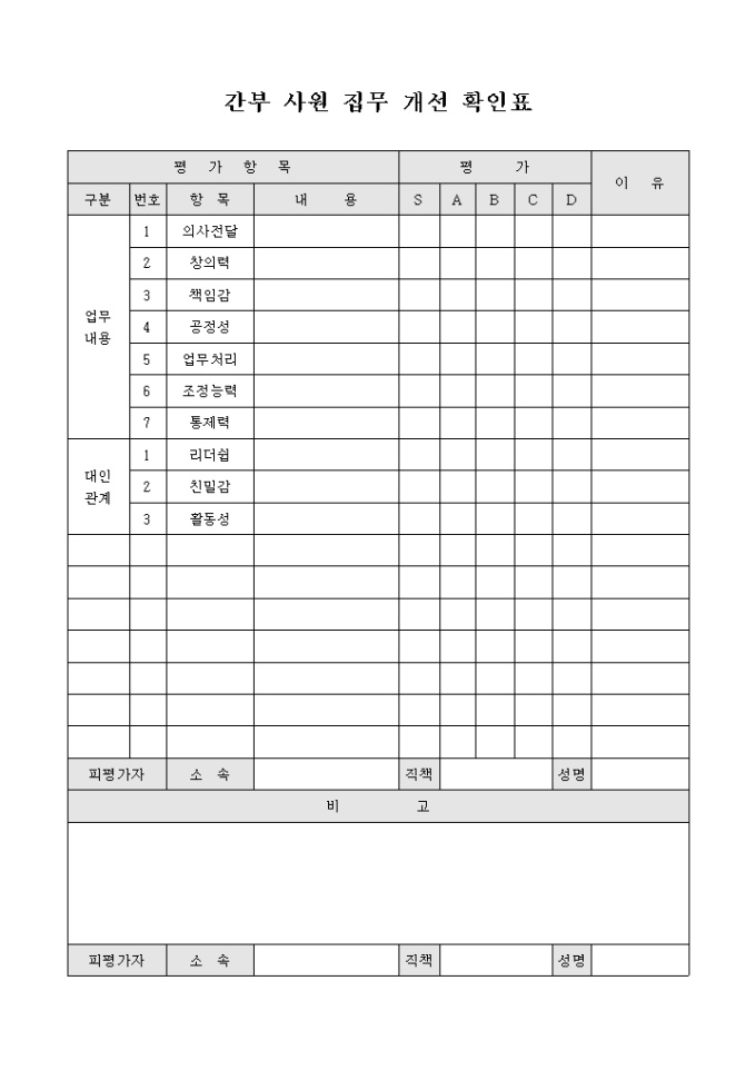 9,000원/월간부 사원의 집무 개선 사항에 대하여 확인을 하기 위해 평가 항목을 작성하여 평가하는 내용의 간부 사원 집무 개선 확인표 양식입니다. 업무내용이나 대인관계 등의 세부항목에 대하여 내용을 평가하고 평가에 대한 이유를 기재할 수 있습니다.