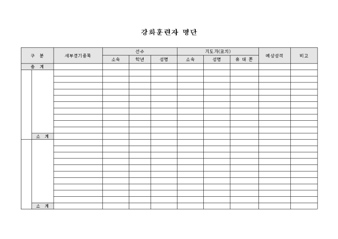 보다 나은 기량을 얻기 위해 강화훈련에 참가하는 선수와 지도자의 인적사항을 기입할 수 있도록 만들어졌으며 세부경기종목과 예상성적을 기입할 수 있게끔 제작된 서식입니다.