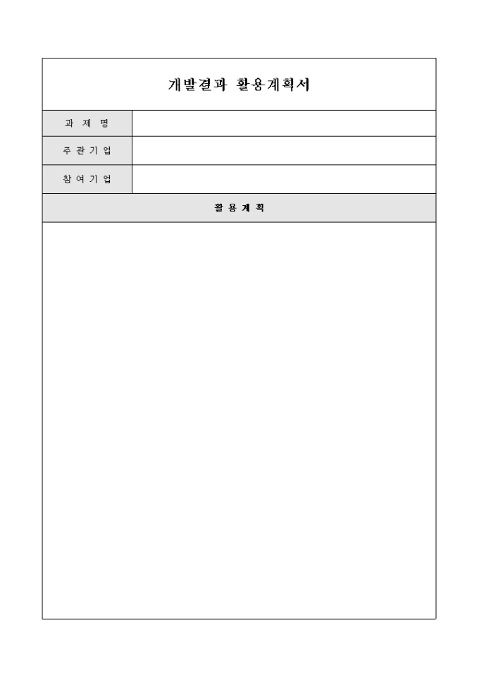 개발 결과에 따라 결과 내용을 활용할 수 있는 계획을 작성하기 위한 개발결과 활용계획서 양식입니다. 해당 과제명과 주관기업, 참여기업 항목과 개발결과의 활용계획에 대하여 서술형태로 기술할 수 있도록 구성되어 있습니다.