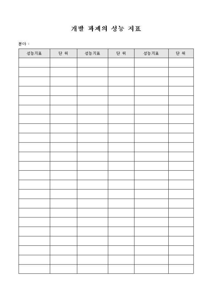 개발 과제의 성능지표에 대해 단위별로 기록할 수 있는 개발 과제의 성능 지표 서식입니다. 분야별 성능지표에 대해 해당 단위를 기록할 수 있습니다.