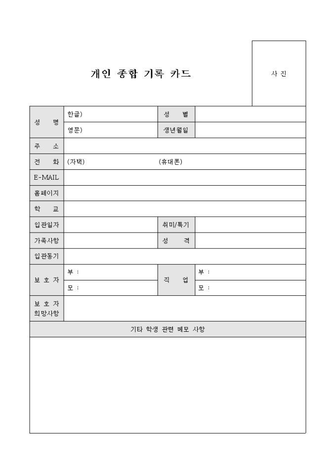 9,000원/월도장이나 체육관에 가입을 희망하는 학생의 신상 등을 기록할 수 있도록 만들어졌으며 보호자 희망사항, 학생관련 메모 사항 등을 기입할 수 있게끔 제작된 서식입니다.
