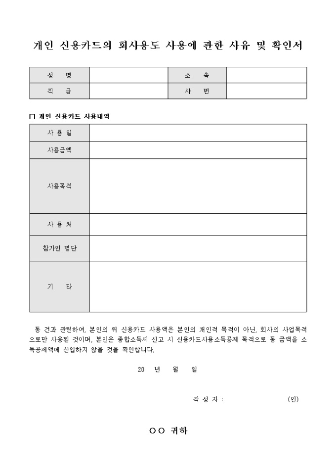 개인 신용카드를 가지고 회사용도로 사용하였을 경우 그에 대한 사유와 사용금액에 대하여 개인의 소득공제액에 산입하지 않을 것임을 확인하기 위해 작성하는 서식으로 해당자의 인적사항과 개인 신용카드의 사용내역을 작성하여 제출할 수 있습니다.