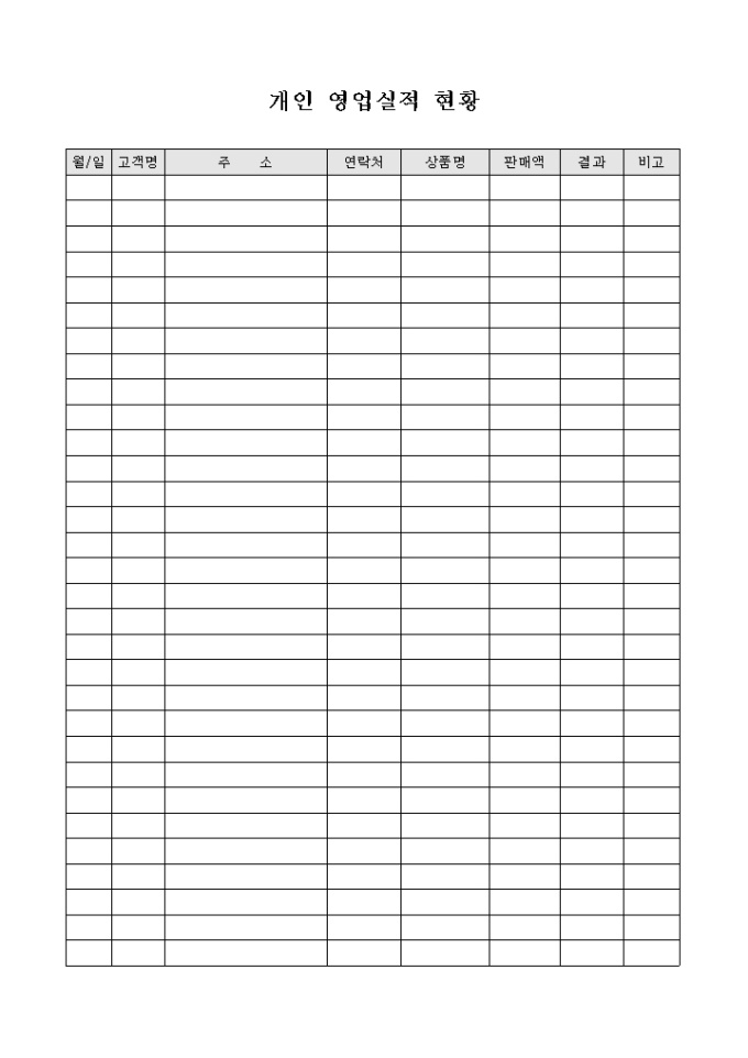 9,000원/월개인의 영업 실적을 기록하여 관리 할 수 있도록 구성된 영업 실적 현황입니다. 일자별 영업실적과 상품명, 판매액을 기록 할 수 있도록 구성되어 있습니다.