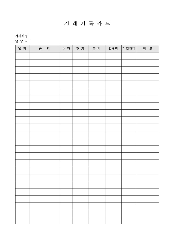 거래처의 거래날짜와 품명, 수량을 기록 할 수 있도록 구성된 거래 기록 카드입니다.