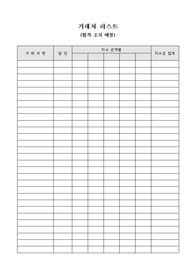 9,000원/월거래 대금을 받지 못한 거래처에 대하여 법적 조치를 취하기 위해 거래처명과 미수금액 등의 내역을 기록하는 거래처 리스트 양식입니다. 거래처명과 담당, 미수금액별 내용과 미수금의 합계 등을 기재할 수 있습니다.