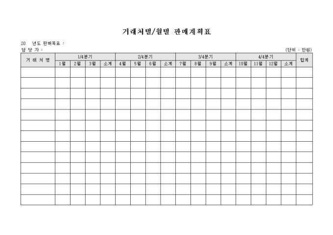 9,000원/월거래처별 월별 판매 계획을 기록한 계획표입니다. 분기별로 구분하여 기록 할 수 있도록 구성되어 있습니다.