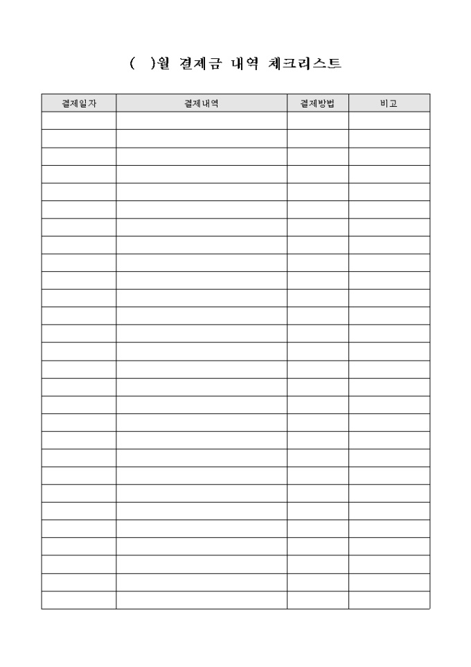거래 업체간의 결제금 내역을 기록하는 결제금 내역 체크리스트 양식입니다. 결제일자와 결제내역, 결제방법 등의 항목을 기재할 수 있습니다.