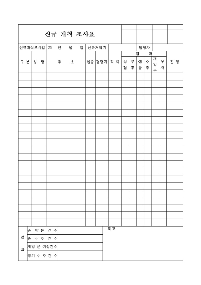 9,000원/월신규개척조사표 양식입니다. 일별 신규개척 업체에 대한 정보를 간략히 기록 관리하는 조사표 양식입니다.