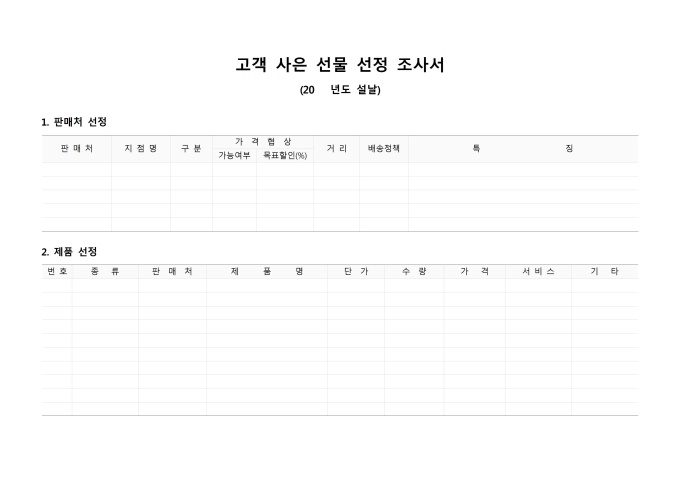 9,000원/월감사 고객에 대하여 설날에 고객 사은 선물을 보내고자 제품을 선정을 위한 조사 내용을 기록하는 고객 사은 선물 선정 조사서 양식입니다. 고객 사은 선물을 담당할 판매처를 선정하고 선물로 보낼 제품에 대하여 기록할 수 있습니다.