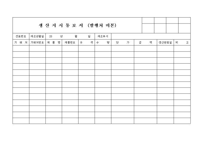 생산지시 통보서(발행처 비본) 양식입니다. 거래처에 생산물품의 정보와 금액, 완료일등의 정보를 통보하는 통보서 양식입니다.