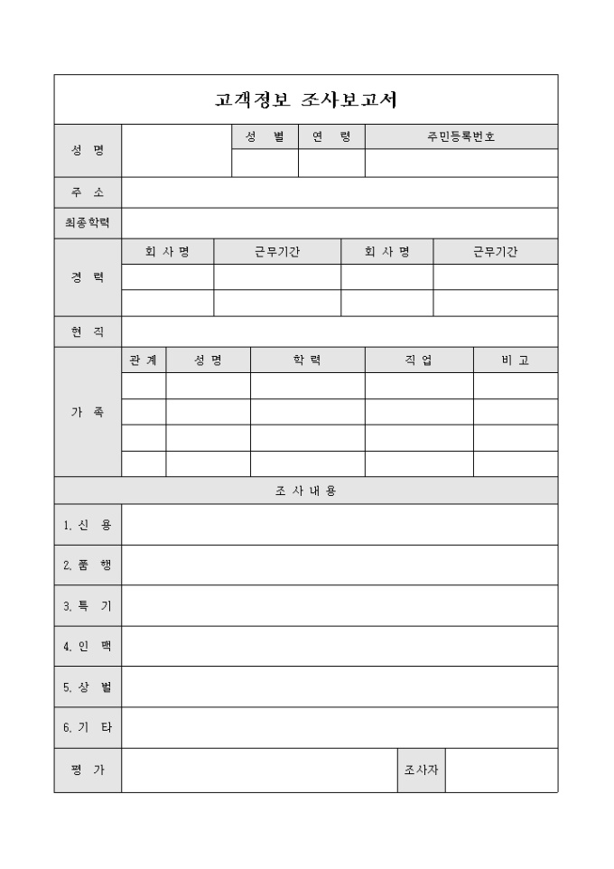 9,000원/월고객의 정보를 조사할 때 사용하는 문서입니다. 고객의 가족과 근무 회사 및 여러 항목에 따른 조사가 가능합니다.
