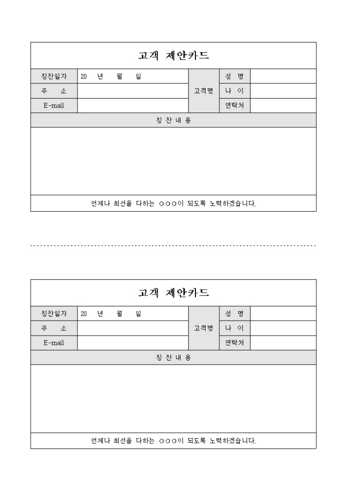 2부로 나누어 사용이 가능한 고객 제안카드 입니다. 고객의 칭찬내용을 서술하여 기록이 가능합니다.