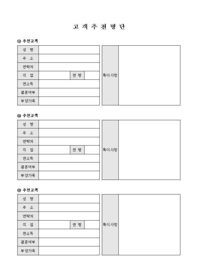 9,000원/월고객 추천 명단입니다. 추천할 고객의 정보와 특이사항을 기록 할 수 있도록 구성된 문서입니다.