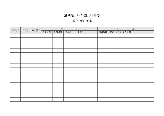 고객별 사이즈 기록부(맞춤 의류 제작)