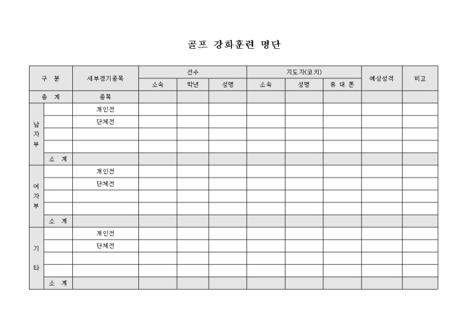 보다 나은 기량을 얻기 위해 골프 강화훈련에 참가하는 선수와 지도자의 인적사항을 기입할 수 있도록 만들어졌으며 세부경기종목과 예상성적을 기입할 수 있게끔 제작된 서식입니다.