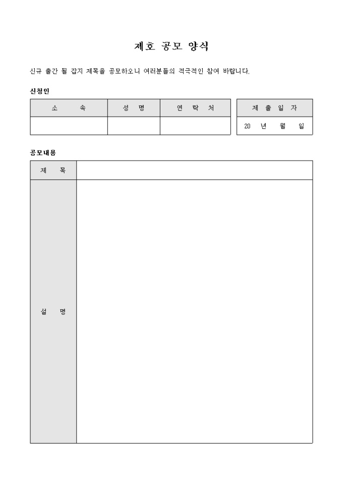 9,000원/월신규 출간 될 잡지의 제목을 공모할 때 사용하는 공모양식입니다. 공모의 제목과 설명을 기입할 수 있습니다.