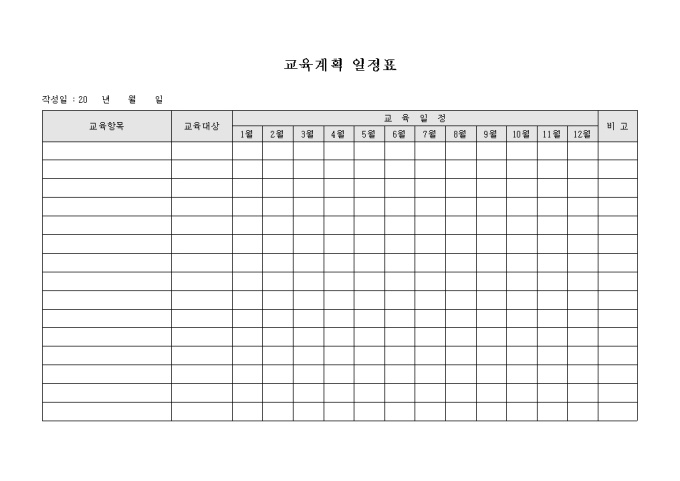 개별 교육항목에 대하여 연간 교육일정을 기재할 수 있도록 구성된 교육계획 일정표 양식입니다. 교육항목과 교육대상에 대하여 기재하고 교육일정이 잡힌 해당 월을 표시할 수 있습니다.