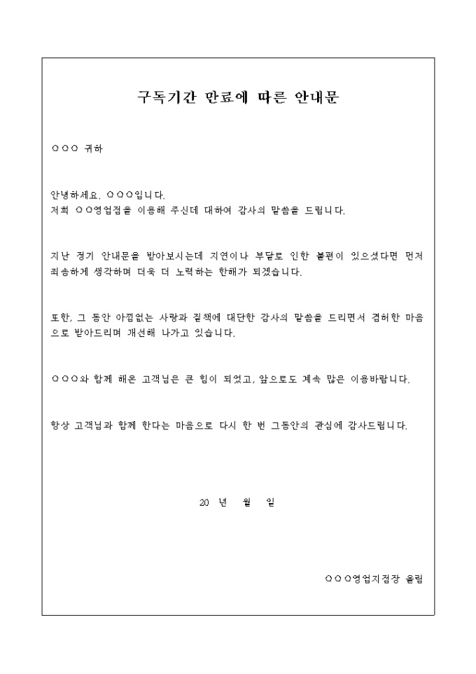 정기 안내문의 구독이 만료시 사용되는 안내문의 샘플 서식입니다. 내용이 포함되어 있습니다.