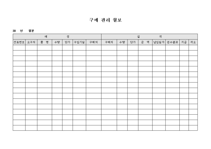 9,000원/월자재 등을 구매하기 위해 소요되는 자재의 예정사항을 파악하고 실제 구매한 자재의 내역을 기록할 수 있도록 구성된 구매 관리 월보 양식입니다.