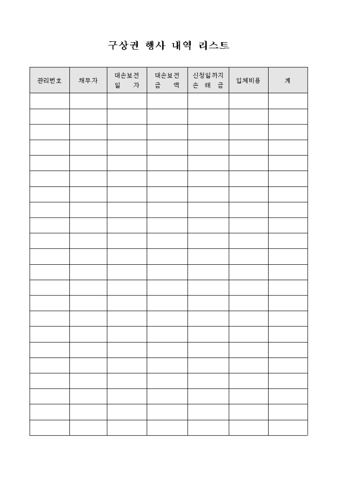 9,000원/월타인의 채무에 대하여 변제를 해준 보증인이 타인의 부당 이득이 발생할 경우 상환을 청구하는 구상권의 행사 내역을 기록하기 위한 구상권 행사내역 리스트 양식입니다. 관리번호, 채무자, 대손보전 일자, 금액, 신청일 까지 손해금, 입체비용 등의 항목으로 구성되어 있습니다.
