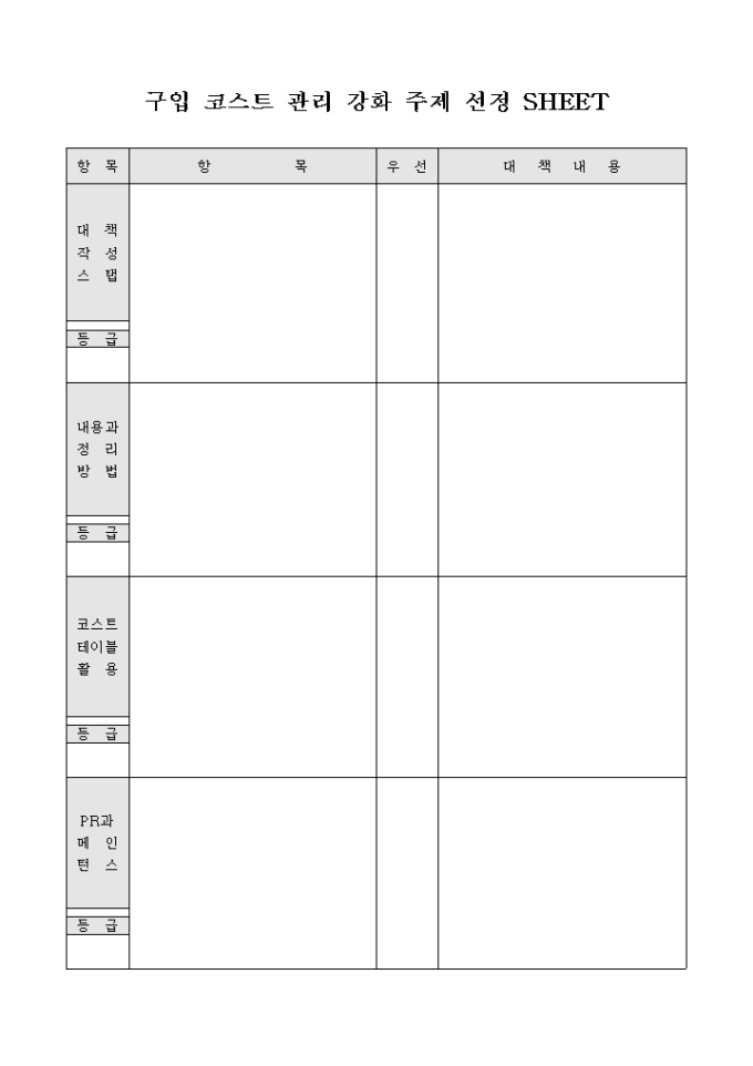 9,000원/월제품 및 부품 등의 구입 비용 관리를 강화하고 대책을 세우기 위한 구입 코스트 관리 강화 주제 선정 SHEET 양식으로 해당 항목에 대하여 대책, 내용과 정리 방법, 코스트 테이블 활용법과 대책을 기재할 수 있습니다.