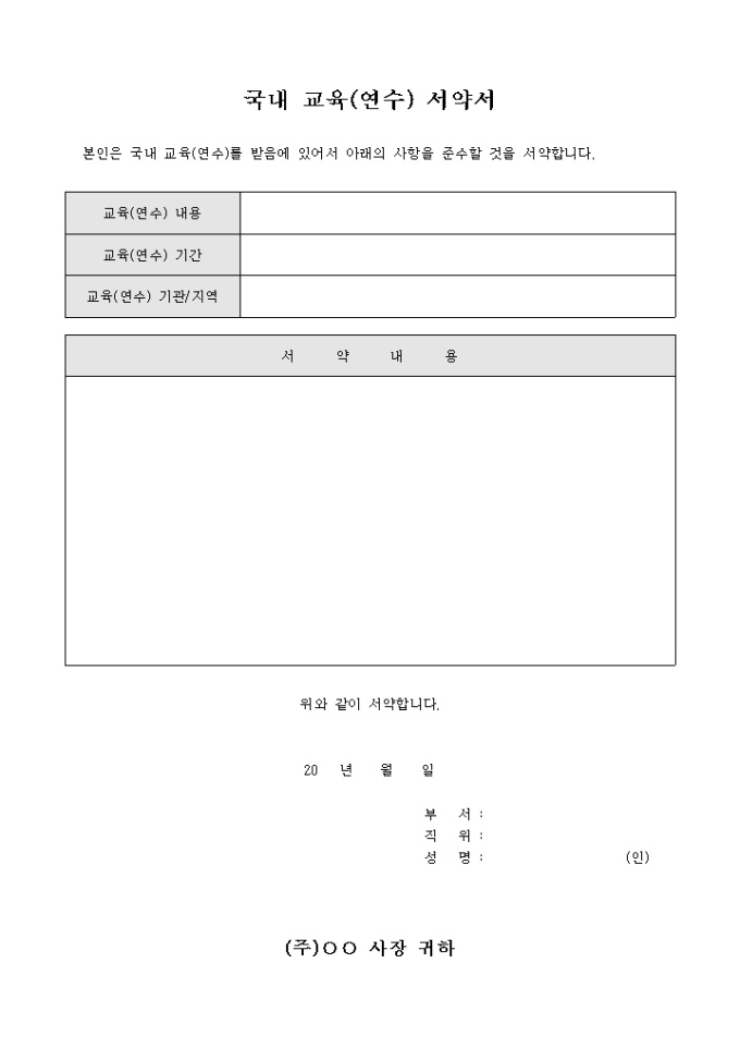 국내에서 들을 수 있는 교육에 대한 서약내용을 작성할 때 사용되는 서식으로써 교육시 주의할 사항 등을 조항을 서술식으로 작성 할 수 있도록 제작되었습니다.
