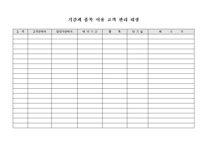 9,000원/월기간제 품목을 이용하고 있는 고객의 관리와 현황을 파악하기 위해 기록하는 기간제 품목 이용 고객 관리 대장 양식으로 고객명과 연락처, 품목, 만기일 등의 사항을 기록할 수 있습니다.